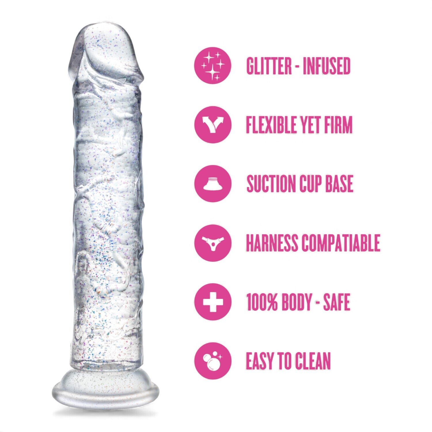 Galan glitteri ei ole vain ulkonäköä varten. Se tekee koko leikkikokemuksesta kevyemmän, leikillisemmän ja viettelevämmän. Pehmeästi joustava, mutta nautinnollisen napakka runko mukautuu vartaloosi ja liukuu sulavasti juuri sinne missä tunnet eniten.