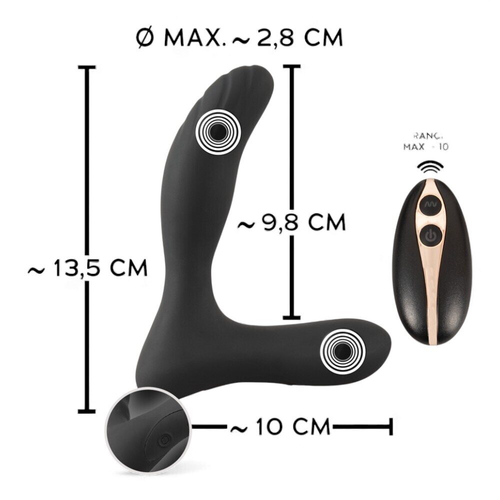 Koko: 13,5 cm • Sisään menevä osa: 9,8 cm • Halkaisija: 1,7–2,8 cm Materiaali: Silikoni (Soft Touch), ABS Ominaisuudet: 2 moottoria, 7 värinäohjelmaa, kaukosäädin (10 m), vedenkestävä Käyttö: Prostata, perineum
