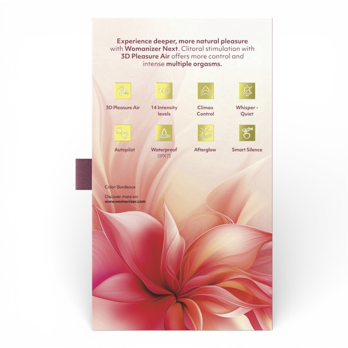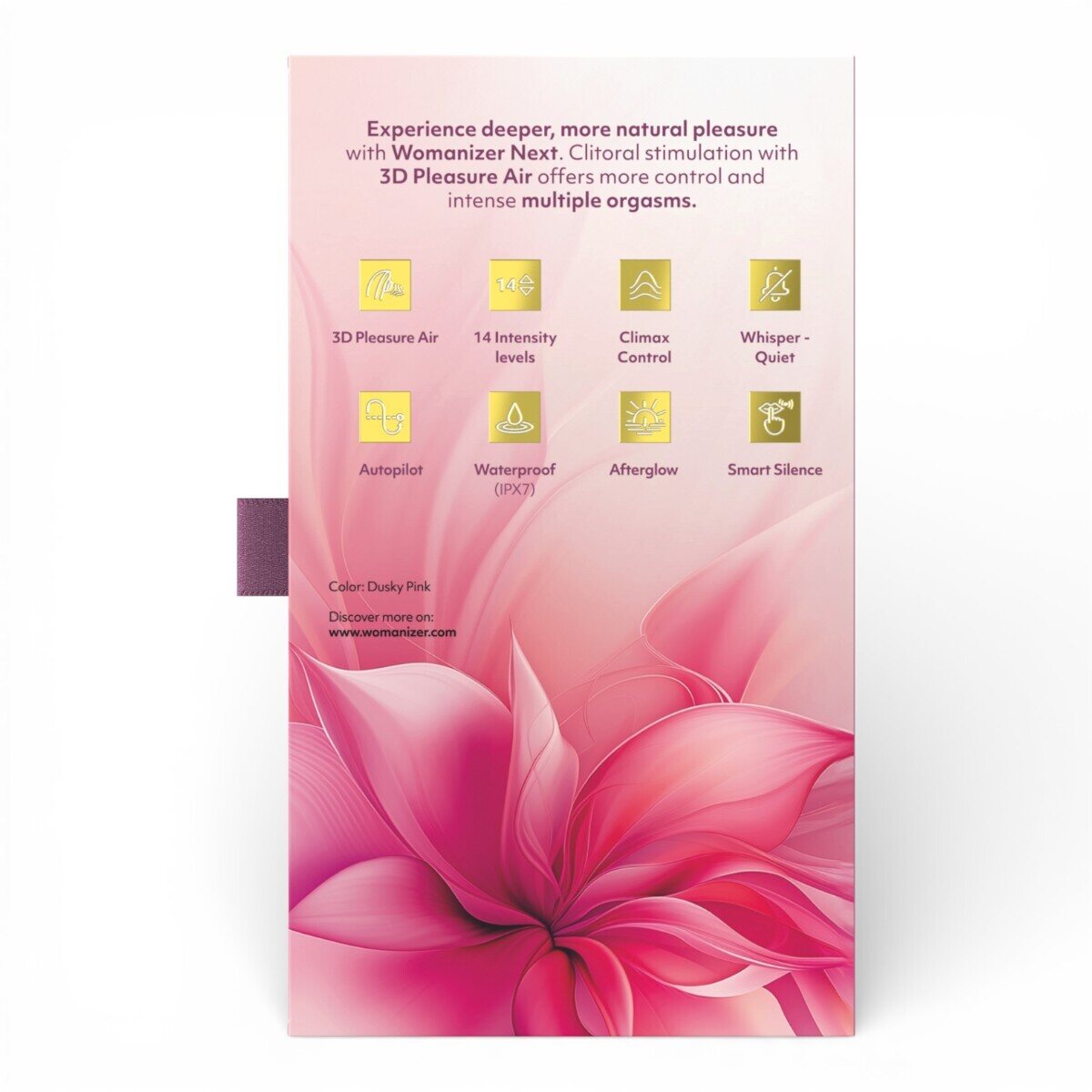 Kyseessä on virallisesti Womanizer NEXT Sensual Collection Clitoral Stimulator, mutta kokemus on paljon enemmän kuin nimi antaa ymmärtää. NEXT edustaa seuraavaa sukupolvea kosketuksetonta klitorisstimulaatiota, jossa sinä päätät tahdin, syvyyden ja hetken.